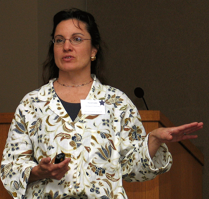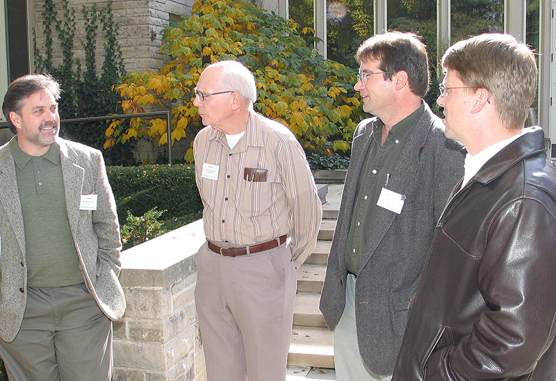 | Photo 1. (l to r) Al Wehrmann, Bill Dixon, Bruce Hensel, and Don Keefer take a moment to catch up during a break. (larger image) | Photo 2. Thornhill Education Center at Morton Arboretum, site of the 2005 Fall IGA meeting. (larger image) | Photo 3. Maria Lemke of the Nature Conservancy discusses effectiveness of best management practices. (larger image) |